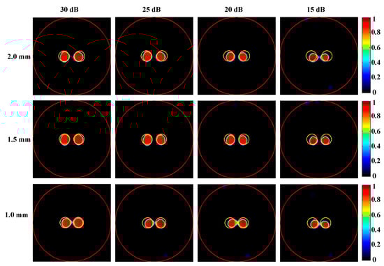 Tomographic images of the targets positioned at different distances with different noise levels were reconstructed based on the proposed DeepCB-XLCT network. The red circle is the boundary of the phantom and the yellow circle represents the true target region. The first to fourth columns are the reconstruction results with the SNRs of 30 dB, 25 dB, 20 dB, and 15 dB, respectively. The first to third row are the results reconstructed with the edge-to-edge distances of 2.0 mm, 1.5 mm, and 1.0 mm, respectively.