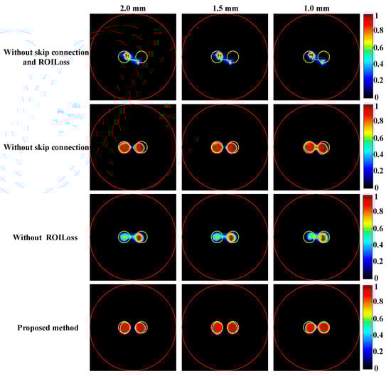 Tomographic images of the targets positioned at different distances were reconstructed in the ablation experiment. The red circle is the boundary of the phantom and the yellow circle represents the true target region. The first to fourth rows are the results obtained based on the proposed DeepCB-XLCT network without skip connection and ROILoss, the proposed DeepCB-XLCT network without skip connection, the proposed DeepCB-XLCT network without ROILoss, and the proposed DeepCB-XLCT network, respectively. The first to third columns are the results reconstructed with the edge-to-edge distances of 2.0 mm, 1.5 mm, and 1.0 mm, respectively.
