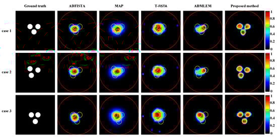 Numerical simulations and phantom experiments were conducted to assess the performance of the proposed DeepCB-XLCT network in CB-XLCT reconstruction using the custom-developed CB-XLCT system. Additionally, for comparison, four traditional methods, namely, adaptive FISTA (ADFISTA, L1 norm), MAP (Gaussian model) [,,], T-FISTA (L1 norm) [], and ADMLEM (Poisson model) [], were implemented to solve Equation (6). In this study, the gradient variation step of the ADFISTA method was set as 0.01, and the iteration numbers were determined by an adaptive iteration termination condition. The MAP method was established based on Gaussian Markov random field, in which the hyperparameters were alternately estimated in each iteration and the objective function was minimized based on a voxel-wise iterative coordinate descent (ICD) algorithm. The regularization parameters and iterative numbers of the T-FISTA method were empirically set as 0.1 and 300, respectively. The ADMLEM method was established based on the Poisson distributed projections, in which the iterative number was set as 800.