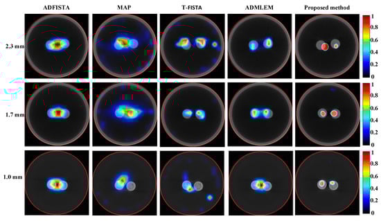 The XLCT tomographic images were reconstructed using ADFISTA, MAP, T-FISTA, ADMLEM, and the proposed DeepCB-XLCT method, as illustrated in Figure 12c–l. All fluorescence images were normalized according to the maximum reconstruction results and presented using a uniform color scale, as depicted in Figure 12c–g. Figure 12h–l presents the fusion outcomes of the XLCT and XCT reconstructed images. In comparison to the ADFISTA, MAP, T-FISTA, and ADMLEM method, the proposed DeepCB-XLCT method exhibits enhanced reconstruction performance in terms of image contrast and shape recovery.