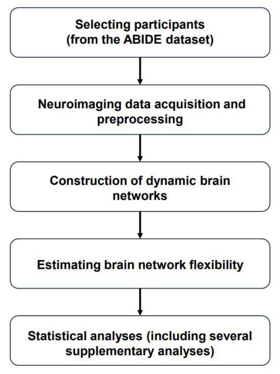 Nevertheless, there are still some notable limitations in the above-mentioned earlier work by Harlalka et al. []. First, their sample size is relatively small: only 72 patients with ASD and 72 typical development (TD) controls from a single study site were included []. Previous researchers have suggested that for human connectome studies, satisfactory statistical power and reliability can be achieved when the sample size is larger than a cutoff of approximately 250 subjects []. Therefore, repeating the study with a larger sample size might be necessary to obtain a more reliable conclusion. Second, besides brain network flexibility at the global level, flexibility can be also estimated at the subnetwork level for particular subsystems of the brain (e.g., for the default mode, visual, and frontoparietal subnetworks). For instance, using the measure of brain network flexibility, a study by Huang et al. [] suggested that childhood trauma experiences are linked to decreased temporal stabilities within the default mode, fronto-parietal, cingulo-opercular, and occipital subnetworks in the brain network. Beyond the global-level brain network flexibility, such results could further strengthen our understanding of the relationship between brain network stability and psychiatric symptoms/disorders at the local level. However, in the earlier study by Harlalka et al. [], there were no results reported on the possible relationship between brain network flexibility and ASD at the subnetwork level, which deserves further investigation. Third, when constructing the dynamic functional brain network, an anatomically based automated anatomical labeling (AAL) atlas with 90 regions of interest (ROIs) was used in the study by Harlalka et al. []. However, it has been well documented that in studies on human functional brain networks, the anatomical-based AAL atlas would have a poorer performance compared to those higher-resolution functional atlases, such as the Dosenbach atlas (with 160 ROIs) and the Power atlas (with 264 ROIs) [,,]. Thus, performing the analyses based on a functional atlas might be also meaningful for obtaining more accurate results.