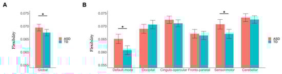Results of comparisons of global and subnetwork-level brain network flexibilities between the autism spectrum disorder (ASD) and typical development (TD) groups. (A) Comparison of flexibility at the global level. (B) Comparisons of flexibilities at the subnetwork level. The “*” indicates a significant between-group difference with corrected-p < 0.05. Details of the definition of “flexibility” can be found in Section 2.5.