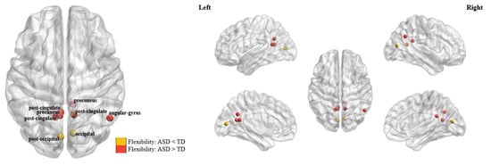 The brain nodes which showed significant differences in flexibility (corrected—p < 0.05) between the autism spectrum disorder (ASD) and typical development (TD) groups.