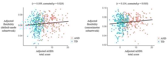 Results of partial correlations (adjusted for sex, age, head motion, and site effects) between the Autism Diagnostic Observation Schedule (AODS) total score and subnetwork-level flexibilities in the entire sample. Abbreviations: ASD = autism spectrum disorder; TD = typical development.