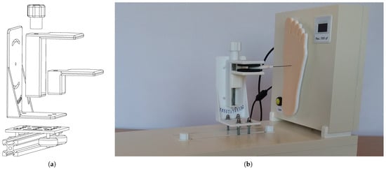 This is a portable element and can be operated alone to carry out measurements with manual application of the monofilament and take measurements, thereby sensing the value of the applied force. However, it can also be coupled with the precision linear displacement system (PLDS) (described next) and work together as a single mechanism in automatic mode. The force sensing system (FSS) (see Figure 4), in summary, is equipped with an OLED screen, a force transducer, a button to carry out the tare measurement, a connector for power input, and a USB Mini-B input for communication with a computer. Finally, an electronic controller (composed of a microprocessor, memory, and digital converters), based on the IC ATmega328, is responsible for carrying out all the programmed operations and executing the commands that will be sent through a computer application. When in automatic mode, the computer fully controls the equipment, i.e., when the FSS is coupled with the PLDS. The fundamental element consists of a force measurement platform, shaped similarly to the morphology of the plantar region of a human foot, which, in turn, is coupled to the force transducer. The surface of the platform has an ethylene–vinyl acetate coating with a texture and hardness chosen to be similar to what is observed with real biological tissues. It will be on this platform that the monofilament under evaluation will apply its strength, in a movement similar to the technique used in the sensitivity evaluation of the diabetic foot. Through this measurement process, it is be possible to obtain the respective inherent value of the buckling force applied by the SWM.