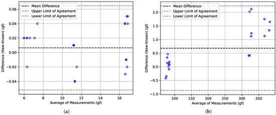 Bland–Altman plots comparing a reference device (MecMesin) and the proposed equipment (FSS): (a) for reference forces near the 10 gf monofilament operation range; (b) for reference forces near the operational range limit of the proposed equipment.