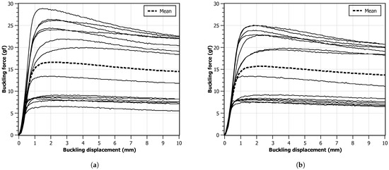 Figure 7 illustrates the force–displacement charts obtained from the experimental data. Upon compression initiation, two distinct regimes become apparent: a linear regime before reaching the critical force , and a buckling regime that follows thereafter. The force contours of the tested devices can be categorized into two groups. The first group exhibits an incremental force rise up to its critical value, maintaining relative stability throughout the entire displacement range. In contrast, the second group demonstrates an overshooting phenomenon, with the critical force slowly decaying during buckling. This behavior may arise from the utilization of monofilament material, which offers superior resistance to compression compared to deflection. By comparing the two charts, it can be observed that, when the displacement speed is higher, this effect is less visible. Looking at the final values, it can be observed that all monofilaments provided a force that is different from the expected 10 gf, and many of them exerted a force twice the expected value. A smaller diversity of behaviors for the 8 mm scenario can also be observed.