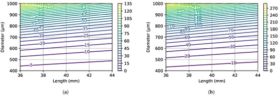 Figure 10 shows the critical force as a function of monofilament length and diameter, for two distinct Young’s moduli. The effect of increased length and reduced diameter (for example considering a manufacturing tolerance) can lead to a severe difference in the critical force. By observing the contour lines’ orientation, the importance of diameter variations can be identified as highly relevant to the devices’ performance (as expressed in Equation (4)). The correct choice of material is also an important factor to consider for manufacturing purposes, as a lower Young’s modulus value allows for a higher dimensional tolerance.