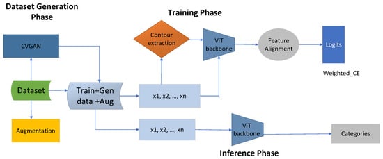 The proposed contour-guided and augmented vision transformer framework has three main phases. The first phase is the data generation phase, during which the dataset is enriched using CVGAN and augmentation, producing a large dataset with training, augmented, and generated data. During the training phase, the total dataset is the sum of the augmented and the generated data. We then extract an equal amount of contour information from the total available dataset, denoted as . We extract , and this information is given to the ViT backbone. The ViT backbone processes both the contour information and original images as , which is then given to feature alignment, where the weighted cross-entropy loss is calculated as . The last stage is the inference phase, where the original images with are given to the ViT backbone to perform categorization or classification.
