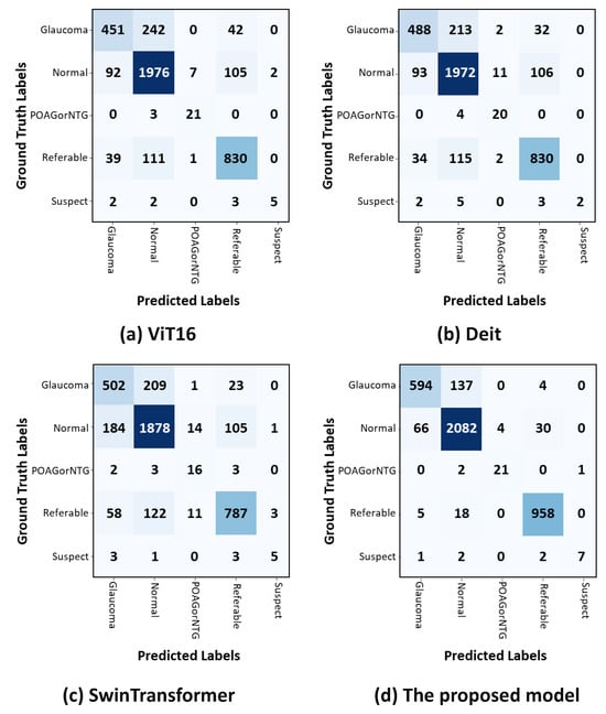 The confusion matrix in Figure 4a shows that in the POAG/NTG classification, the ViT achieved the highest results with 87.5%, whereas in the glaucoma classification, it attained the lowest results with 61%. Figure 4b shows that DeiT achieved the highest results in the POAG/NTG classification with 83%, whereas it faced challenges in classifying suspect classes, attaining the lowest results with 46%. The confusion matrix in Figure 4c demonstrates the proposed method’s competitive classification performance. In the POAG/NTG class, the proposed approach achieved the lowest classification results (68%), but it more accurately identified referable cases (80%). In Figure 4d, it can be seen that the proposed model (CA-ViT) surpassed all other approaches in classifying all classes of glaucoma. The attained results for classifications of normal (95%) and referable (97%) were high, and it demonstrated the lowest performance (80%) in the identification of the glaucoma class. The confusion matrix presented in Figure 4 indicates that the number of fundus images within each class had a great impact on the accuracy achieved. The number of fundus images was very small for classes like suspect and POAG/NTG, resulting in lower confusion matrix values compared to the other three classes—specifically glaucoma, normal, and referable—which had higher numbers of fundus images. Although this outcome reflects the reality and robustness of the proposed model, balancing the class distribution is a good option to consider.