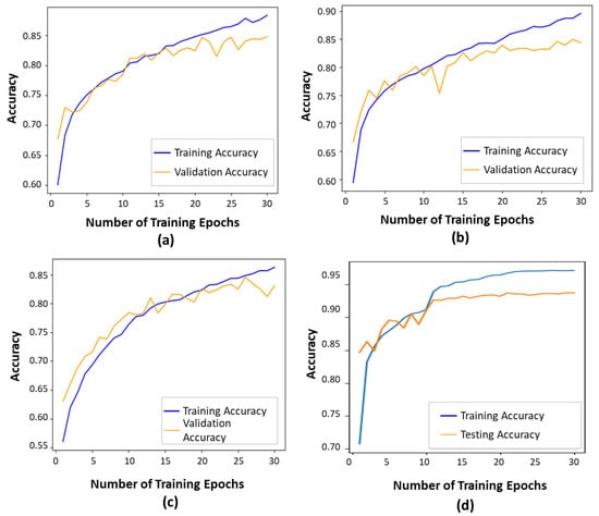 Training and validation accuracies show how well a deep learning model performs during training and generalizes to unseen data, respectively: (a) The ViT16 model exhibited a training accuracy of 87% and a validation accuracy of 81%. (b) The DeiT model exhibited a training accuracy of 89% and a validation accuracy of 81%. (c) The Swin transformer exhibited a training accuracy of 86% and a validation accuracy of 78%. (d) The proposed model.