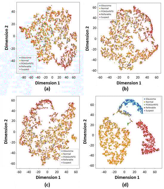 The verification of glaucoma classification is shown through the application of the t-distributed stochastic neighbor embedding (t-SNE) visualization technique. This method converts high-dimensional features into lower dimensions while retaining crucial features. The t-SNE technique enhances the accurate identification of each class through both depth-wise and color-wise strategies: (a) The Vit16 t-SNE method illustrates classification performance by distinguishing each class with a variety of colors. (b) The DeiT t-SNE-based approach categorizes each type of glaucoma. (c) The Swin transformer t-SNE method classifies each glaucoma category. (d) The performance of the proposed method’s t-SNE-based classification significantly exceeds that of other relevant studies.