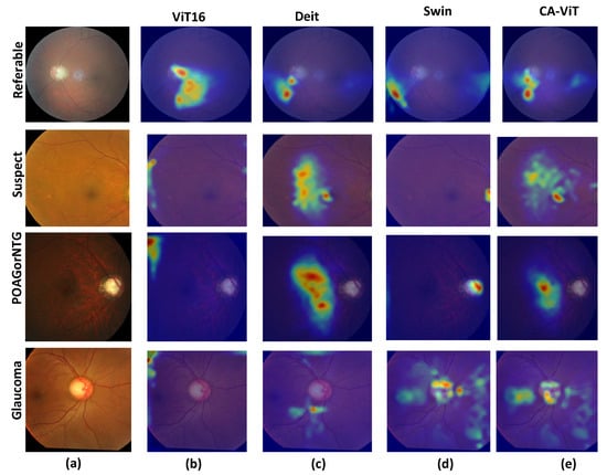 The attention heat maps for SOTA comparison: (a) The input disease types, which include four classes: POAG/NTG, glaucoma, referable, and suspect. (b) The attention heat maps for ViT16. (c) The attention heat maps for DeiT. (d) The attention heat maps for the Swin transformer. (e) The attention heat maps for CA-ViT (the proposed model).