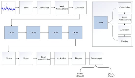 As shown in Figure 2, PAFNet consisted of 26 layers, including 5 convolutional layers. The input size is the same as the sliding window, with each sample represented by a matrix of one row and N columns, where the column number is the index of the R-R interval, and the value is the corresponding R-R interval duration in seconds. The 1D convolutional layer, batch normalization layer, activation layer, and 1D maximum pooling layer were abstracted as a block CBAP layer. The convolutional layer automatically extracted feature maps using kernel techniques, while the batch normalization layer accelerated training and improved accuracy. The activation layer increased the non-linearity of the model, and the pooling layer reduced the scale of the feature map. The flatten layer converted all feature maps into one row as input to the dense layer for the final prediction. The output represents the binary prediction result of PAFNet.