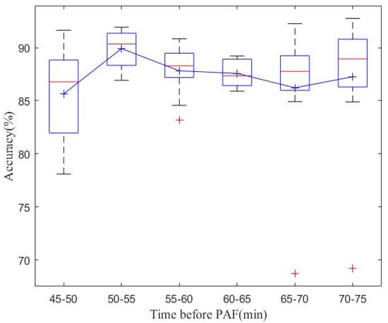 Comparison of model classification accuracy using ECG signals in different time periods before onset of AF as input data of PAFNet. Explanation for the notations: (a) Red line: the median value for each time interval; (b) Red +: outliers; (c) Blue square: the bottom and top edges represent the first and third quartiles; (d) Black dash lines: to show the rest of the distribution, excluding outliers. (e) Blue +: the mean value.