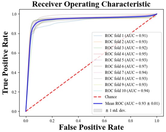 Receiver operating characteristic (ROC) curves of the ten folds during the model test.