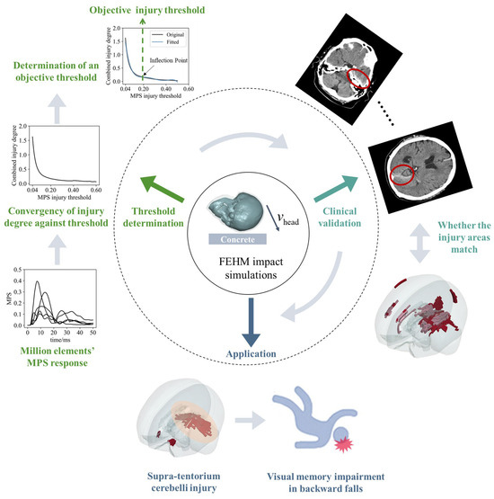 In this study, an FEHM was used to simulate head impacts with the aim of determining an objective injury threshold for the MPS criterion in brain tissue. The method consisted of three main parts: (1) threshold determination, (2) clinical validation, and (3) application to backward falls. As illustrated in Figure 1, a large dataset was first established through multiple non-injurious head impact simulations under various conditions. A combined relationship between injury degree and injury threshold was built by analyzing the responses of millions of brain tissue elements. Based on the stationary value principle, a hypothesis was proposed, and the objective injury threshold was determined from the converged relationships. This data-driven method significantly differs from the previously mentioned clinical case-driven approach. The threshold was validated by comparing the predicted injury areas with CT images from a TBI case. Finally, the validated threshold was applied to backward falls, predicting whole-brain injury through finite element simulations of the designed occipital impacts. Combined with the relevant neuroscience literature, the biomechanical mechanism underlying visual memory impairment due to occipital impact is explored.