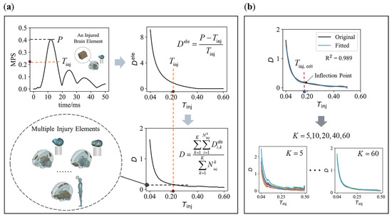 The relationship of combined injury degree against injury threshold and its . (a) Extract the peak MPS from the element’s time histories, and calculate the element injury degree based on and the given injury threshold (highlighted red dot). Then, a combined injury degree of all injured elements under impact cases is calculated. As increases, and decrease, forming a relationship between and ; (b) 5th-order polynomial fitting is used to solve for the of a curve (K = 5, 10, 20, 40, 60).
