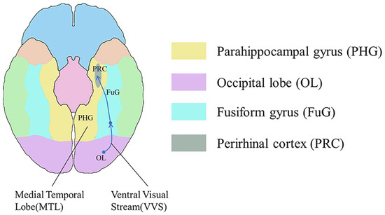 Figure 5 illustrates a representational–hierarchical framework comprising the ventral visual stream (VVS) and the medial temporal lobe (MTL), both recognized as key areas for visual perception and memory functions [55]. In this study, we reference this framework in relation to memory function. The MTL primarily includes the hippocampus, along with the closely associated entorhinal, perirhinal, and parahippocampal cortices [56]. The VVS begins in the primary visual cortex and extends along the ventral side of the temporal lobe towards the piriform cortex.