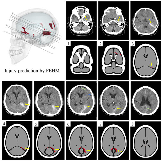The comparison of injury areas in FEHM and CT images. Clinically, there is hematoma or contusion from the temporal lobe to the upper tentorium (yellow arrow), as well as hemorrhage in the falx cerebri, between the cerebral hemispheres (green arrow), and contusion in the sylvian fissure (blue arrow). The FEHM injury predictions of the corresponding sections are below the CT images. In sections 3–7, the yellow arrow indicates the injury above the tentorium, which corresponds to the clinical results. In addition, injuries in the orbitofrontal region are also indicated (section 2), which are not present in CT images. Hemorrhaging between the cerebral hemispheres and contusions in the sylvian fissure are visible only in the CT images (sections 6 and 8).