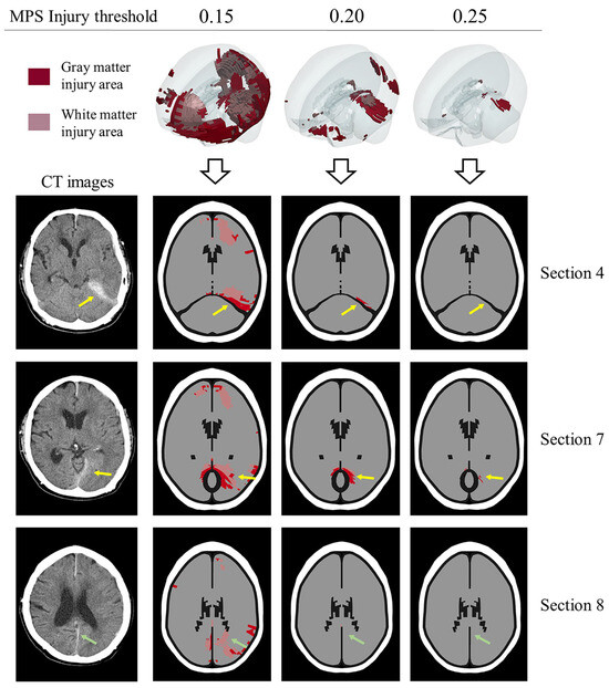 The rationality of the MPS objective injury threshold (0.2) in predicting entire brain injury is evaluated. The prediction effects of thresholds 0.15, 0.2, and 0.25 are compared with CT images. Red color indicates gray matter element injury, pink color indicates white matter element injury, and elements not highlighted are not injured. The yellow arrow and green arrow indicate the injuries in the supra-tentorium cerebelli and between the cerebral hemispheres, respectively. The prediction area of 0.15 is significantly larger, and the prediction area of 0.25 is significantly smaller. In comparison, the prediction effect of 0.2 is more consistent with the CT images.
