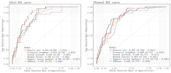 | Men’ Models | Training Set AUROC | Test Set AUROC (95% CI) | AUROC Test | p | Kappa (95% CI) | F1 Score (95% CI) | Precision (95% CI) | Accuracy (95% CI) | Sensitivity (95% CI) | Specificity (95% CI) |