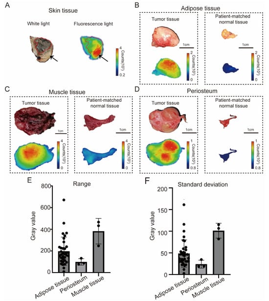 Fluorescence signal distribution in different control tissues. (A) White light and fluorescence imaging results in a representative skin tissue. The red dotted line outlines the diseased tissue and the arrow indicates the normal tissue. (B–D) White light and fluorescence imaging results in tumor tissues and patient-matched normal tissues (adipose, muscle, and periosteum tissues). (E,F) The range and standard deviation of gray values in the fluorescence imaging results of adipose, periosteum, and muscle tissues.