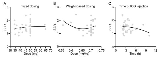 Correlation between the SBR of adipose tissue and the dose of ICG (A,B) or the time of ICG injection (C).