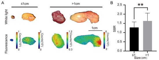 The fluorescence imaging results of adipose tissues might be affected by their sizes. (A) In four typical adipose tissues, the large ones (>1 cm) showed stronger fluorescence than the small ones (≤1 cm). (B) The calculated SBR of adipose tissues was also in proportion to the tissue size. The SBR of large tissues (>1 cm) is significantly higher than that of small tissues (≤1 cm). ** p < 0.01.