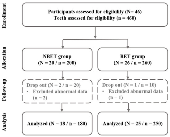 As for the bioelectric toothbrush [17], a toothbrush producing a 100 mA microcurrent with the simultaneous application of direct and alternating current electrical mechanisms was used (Figure 1). For the control group, a toothbrush that did not produce a microcurrent, but emitted light was used, as it appeared superficially identical to the bioelectric toothbrush. During a 7-week period, 3 participants (overseas business trip, moving) were eliminated, resulting in 25 in the BET and 18 in the NBET (Figure 2).