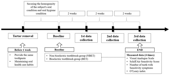 To ensure consistency of the oral environment, the participants received an oral examination by a dentist and light scaling by a trained dental hygienist at a preventative dental clinic prior to the study. After a 1-week recovery period, the study commenced. Participants were provided with F 1450 toothpaste and requested to maintain their usual dental care habits, including toothbrushing method and oral health behavior, during the study period. During the study period, intake of carbonated drinks, alcohol, sweet foods, acidic foods (fruits with high acid content such as lemon), and cold water (ice) that could affect the symptoms of cold was limited. On the first day of the study, a survey and an oral examination were conducted (i.e., baseline data were collected), and data were collected a total of 3 times during the 6 weeks of home care (Figure 3).