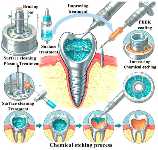 This research aims to investigate the potential of Polyether ether ketone (PEEK) as an alternative material for dental implants, focusing on its surface modification of an implant, making it a promising candidate for medical applications. This study aims to enhance the surface properties of PEEK through advanced surface modification techniques, such as plasma/thermal treatment and etching, to improve its adhesion, reduce inflammation, and increase its integration with bone tissue. By comparing the performance of PEEK with traditional materials like titanium and composite resins, the research demonstrates PEEK’s superior structural integrity, lower degradation rate, and reduced microbial colonization. The ultimate goal is to provide a comprehensive understanding of PEEK’s advantages, thereby supporting its adoption in dental practice as a viable and improved alternative to current implant materials.