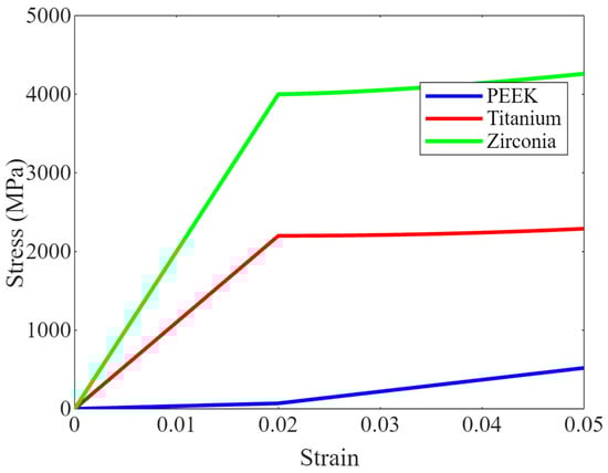 The tensile tests revealed that PEEK exhibits an elastic modulus of approximately 3.5 GPa, a tensile strength of 100 MPa, and an elongation at a break of 7%. These values underscore PEEK’s capability to withstand the regular forces experienced within the oral cavity without permanent deformation. Figure 2 shows a graph illustrating the mechanical performance of PEEK compared to titanium and zirconia under similar stress conditions. As depicted, PEEK shows a different stress–strain relationship than the more rigid materials like titanium and zirconia, potentially offering advantageous flexibility and shock absorption properties, which could be beneficial in dental applications where adaptability to varying stress in the oral environment is crucial [,]. This characteristic enhances patient comfort and makes PEEK preferable for specific dental applications.