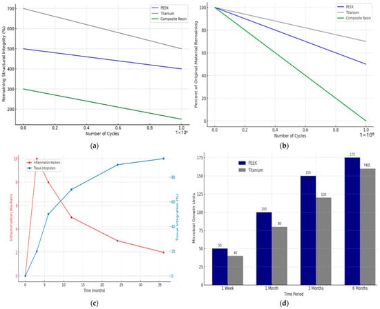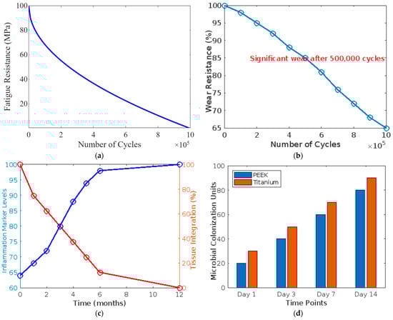 (a) Line graph depicting the fatigue resistance of PEEK under cyclic loading conditions; (b) line graph showing the wear resistance of PEEK under simulated oral conditions; (c) line graph displaying long-term biocompatibility indicators, tracking inflammation markers and tissue integration over time; (d) bar graph comparing microbial colonization rates on PEEK and titanium surfaces.