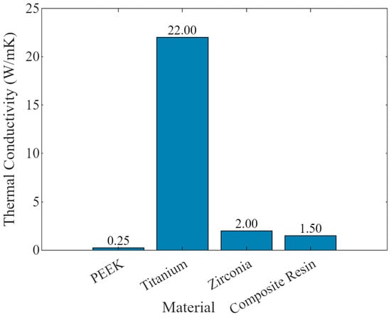 Bar graph showing the thermal conductivity of PEEK compared to other dental materials such as titanium, zirconia, and composite resin.