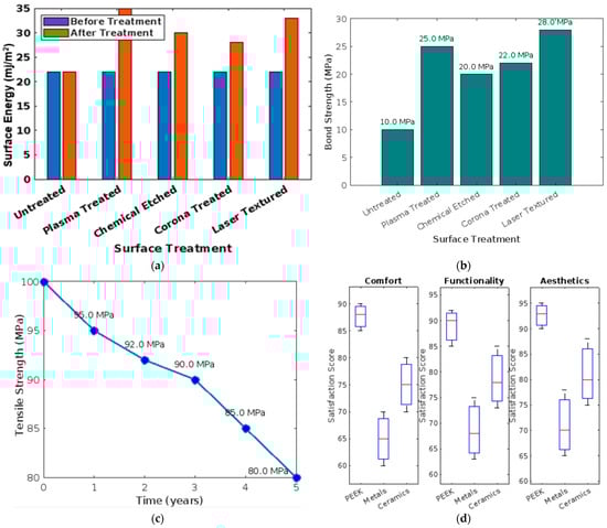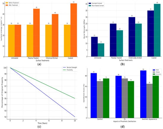 (a) Bar graph showing surface energy comparisons before and after surface treatments on PEEK; (b) graph displaying the impact of surface treatment on the bond strength of PEEK to dental types of cement; (c) line graph illustrating the effect of aging on the mechanical properties of PEEK in dental applications; (d) patient satisfaction scores statistical representations comparing patient satisfaction related to comfort, function, and aesthetics of PEEK versus other materials.