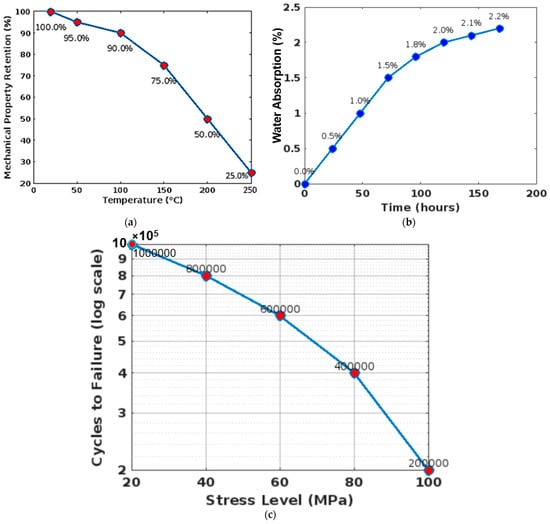 (a) Thermal stability charts; (b) water absorption curves; (c) fatigue cycle graphs.