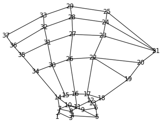 MRF topology used for this dataset. Each vertex represents one of the 37 unique landmarks in the studied hand dataset. The topology is inspired by the anatomy of the human hand, with additional edge connections between fingers to increase the spatial constraint.