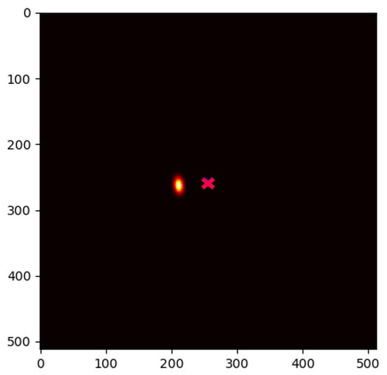 Due to the application of , there may be responses outside the initial image boundary set by the input images. Therefore, the resulting heatmaps have twice the resolution of their input images. Consequently, Figure 3 shows a image illustrating the GMM result of , even though the original input images it was trained on had an image resolution of . Also, Figure 3 shows where Landmark 2 should be, given the location of Landmark 6, which was translated to the center of the image.