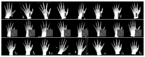 Examples of perturbed images from 3 batches of 8 input images used in training. Each image in a batch has the same perturbation. Bright regions are regions with intensities above 1.0 (due to data augmentation) and are clamped to 1.0 for visualization purposes (stronger contrast between artificial occlusions and bone tissue).