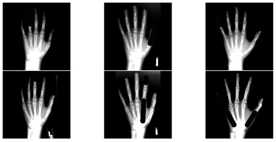 Six example test images with artificial finger occlusions. Bright regions are regions with intensities above 1.0 (due to data augmentation) and are clamped to 1.0 for visualization purposes (stronger contrast between artificial occlusions and bone tissue).