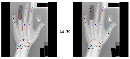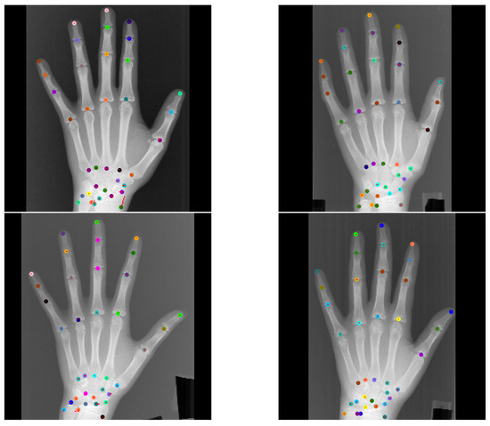 We used the Digital Hand Atlas dataset (https://ipilab.usc.edu/research/baaweb/dbdform/ last accessed 19 July 2024) with annotations provided at (https://github.com/christianpayer/MedicalDataAugmentationTool-HeatmapRegression/tree/master/hand_xray/hand_xray_dataset/setup last accessed 19 July 2024), which has been extensively studied in the ALL literature [15,17,20,24], where hand bone landmarks can be used as an initial stage, e.g., for bone-age estimation [32,33,34]. It contains 895 2D X-ray images of hands, each having 37 landmark annotations. There is no information about the physical resolution for this dataset, which is very important for medical applications. Hence, there is a normalization procedure found in the literature [15] that defines an image-specific normalization constant, , which is defined as