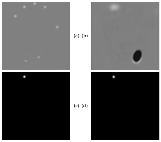 (a) Localization (U-Net) output. Locally accurate, but globally ambiguous landmark predictions. (b) Spatial configuration output. Spatial filter for landmark disambiguation. (c) Final SCN output. (d) Target heatmap. The gray areas in the top images are due to the fact that these images have a very different intensity distribution than the bottom images. Therefore, they are shown with different contrast settings to visually depict the intensity range within each image more clearly.