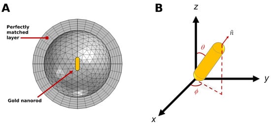The absorption cross sections of gold nanospheres were obtained using Mie theory. The nanosphere diameter was varied from 5 to 100 nm for value analysis. For nanorods, plasmonic properties were appraised by means of finite element method (FEM) electromagnetic simulations in COMSOL Multiphysics, where a single AuNR of length L and diameter D was placed in a dielectric medium (water). The surrounding medium refractive index was assumed to be wavelength-independent and bounded by a perfectly matched layer (PML) with spherical symmetry, mimicking an open boundary and avoiding the reflection of scattered light. AuNR length (L) and diameter (D) were swept from 15 nm up to 200 nm. Figure 1A illustrates the cross section of the meshed model. Due to the elongated shape of the AuNRs, their relative orientation to the polarization of incident light is significant to the nanostructure absorption cross section value and, consequently, affects the optical heating of plasmonic nanostructures []. Figure 1B shows the possible orientations of AuNRs, considering an incident electric field with polarization fixed along the x-axis. In Figure 1B, the unit vector is parallel to the long axis of AuNR. The angle is in the x–y plane, which is obtained from the x-axis to the projection of unit vector on the x–y plane, where the angle between and the x–y plane is . Here, averaged values () were obtained considering and values ranging from 0 to 90°.