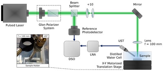 The water immersion ultrasonic transducer (UST) (Olympus V310-N-SU, 5 MHz) was positioned at an angle to maximize the PA signal from the sample and minimize the effects of reflection and absorption at other interfaces, allowing the focused beam (f = 100 mm) to reach the sample. The sample was scanned using an X–Y motorized translation stage placed under the water cell, comprised of two 50 mm linear stages (MTS50-Z8—50 mm, Thorlabs, Inc., Newton, NJ, USA). The acquired signal was amplified 19.4 times using a radio frequency low-noise amplifier (LNA) (ZFL-500LN-BNC) connected to a digital storage oscilloscope (DSO).