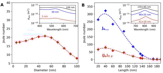 Figure 3B depicts the maximum theoretical Joule number values (, blue cross) for AuNRs as function of NP length. The maximum values are achieved considering the NP long axis parallel to the polarization of light. The average values (, red cross), considering and values ranging from 0 to 90°, are displayed in Figure 3B. The inset of Figure 3B depicts the absorption cross section spectrum for AuNRs of sizes , , and nm, indicating an AuNR plasmonic peaks close to 808 nm. The dashed lines in Figure 3 serve as a visual guide for the points (+) obtained from the theoretical models.