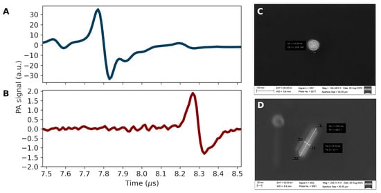 Metallic nanoparticles can be used as contrast agents for photoacoustic imaging. Figure 4A,B illustrate the photoacoustic response of samples containing 50 nm AuNSs (solid blue line, nm) and nm AuNRs (solid red line, nm), respectively, after one laser pulse. SEM for the 50 nm AuNS and nm AuNR samples taken after photoacoustic measurement are shown in Figure 4C,D, respectively.