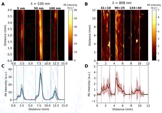 Experimental PAMs and PA intensities of colloidal gold samples containing NPs of different sizes. (A) PAM of 5, 50, and 100 nm AuNS samples ( = 530 nm, FoV = mm). (B) PAM of , , and nm AuNS samples ( = 808 nm, FoV = mm). The color bar depicts the PA intensities of the PAMs (virtual colors), and the vertical dashed lines indicate the boundary of the capillary tubes. (C) Average PA intensity profile of the AuNS samples along the tubes (solid blue line) ± error range (light blue filled region). (D) Average PA intensity profile of the AuNR samples along the tubes (solid red line) ± error range (light red filled region).
