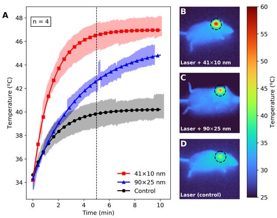 Laser heating of the tumors inoculated with saline led to temperatures up to 40.7 ± 1.1 °C, as indicated by the black line in Figure 6A. Figure 6A shows that, after 5 min of laser exposure, the S180 volume inoculated with nm AuNRs reached thermal equilibrium. This is not the case for the nm AuNR inoculation, which requires a longer period of irradiation (more than 10 min) to reach the maximum temperature. Therefore, using optimized nanoparticles reduces the time needed to achieve higher temperatures, thereby decreasing the overall therapy time. Moreover, the nm PEGylated AuNRs have also been shown to be efficient nanoheaters for photothermal fungal inactivation [].