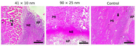 Photothermal damage to tumor cells injected with AuNRs was confirmed by histological examination (Figure 7), as the irradiated tissues containing and nm NPs form solid blocks of coagulative necrosis. The simultaneous presence of apoptosis, necroptosis, and necrosis pathways in both cases are implicated in temperature-dependent cell death patterns. At temperatures below 43 °C (low temperatures), cell killing is ineffective, as cell viability remains above 50%, while at 46 °C (medium temperatures), both apoptosis and necroptosis are the main contributors to cell death []. When temperature is raised above 49 °C (high temperatures), cell death become necrosis-dominant []. The absence of coagulative necrosis from irradiated tumors inoculated with saline (Figure 7, control) corroborate the low average temperature observed for the control (∼40 °C), below the 43 °C mark, despite the considerably higher temperatures achieved at the center of the tumor. Furthermore, the similar area between necrotic and apoptotic regions of irradiated tumor tissues containing NPs are indicative of medium-temperature PTT. Notwithstanding the respective maximum temperatures of 65.0 °C and 61.8 °C for and nm, respectively, the average temperatures observed are compatible with medium-temperature PTT.